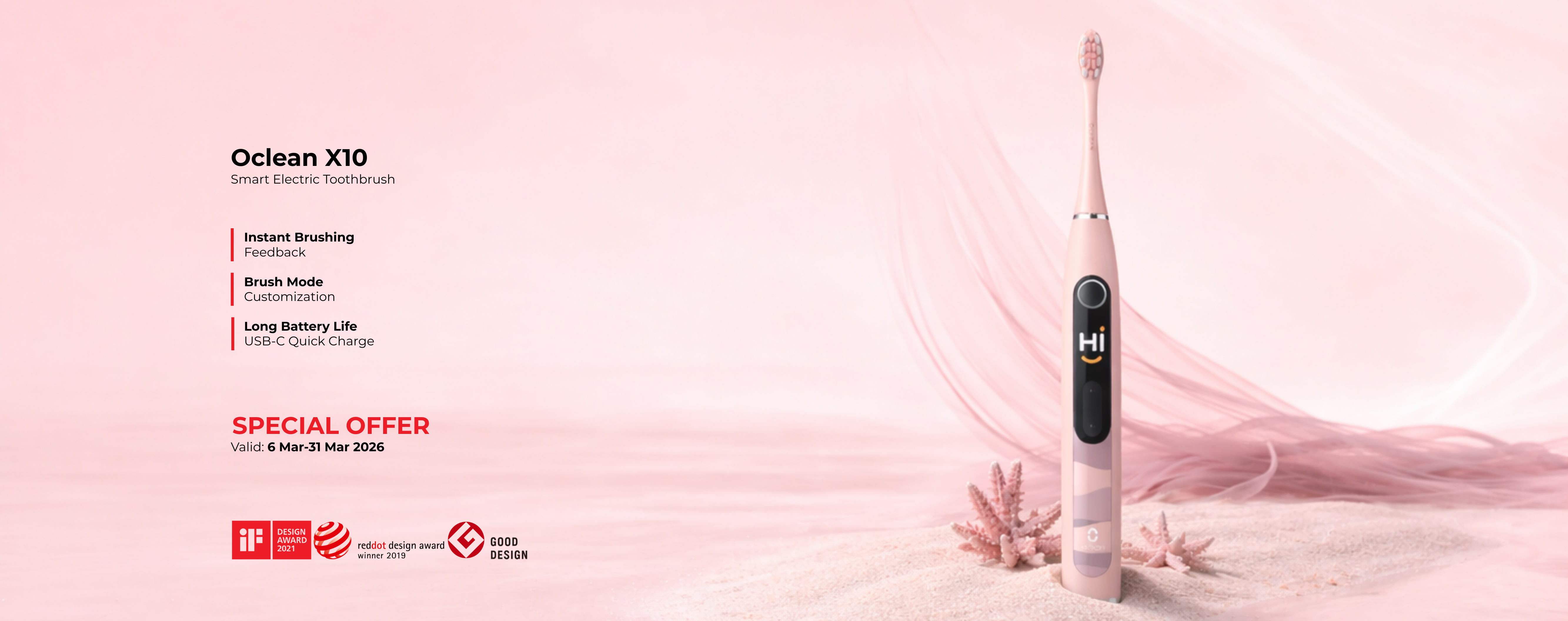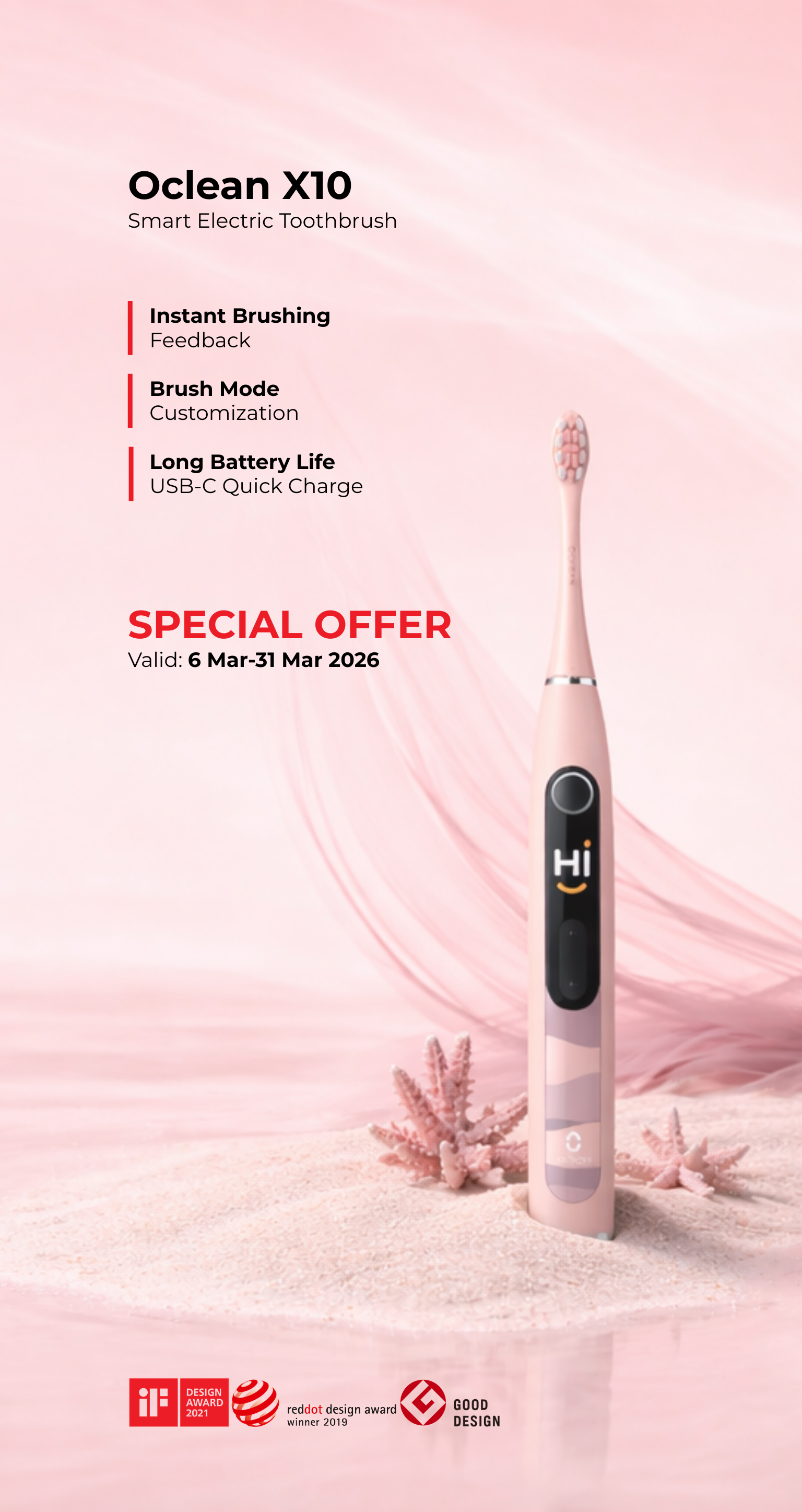 Elegant ergonomisk design med AI-drevne bevægelsessensorer: Børstevaner korrigeres i realtid.